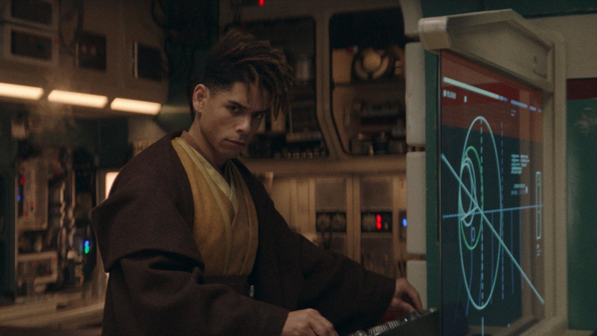 Aber es gibt einen Unterschied zwischen der Verkörperung eines guten Jedi und der Verkörperung des Jedi-Ordens – selbst auf seinem vermeintlichen Höhepunkt, den er in der Ära der Hohen Republik erreicht – und dieser Unterschied ist der Punkt, an dem Yord, Gott segne ihn, hereinspaziert. Von der Minute an, in der wir Yord treffen, wie er auf die Brücke des Schiffs der Handelsföderation stolziert, auf dem Osha arbeitet, sind seine Tempelroben ein wenig zu makellos, ein wenig zu knackig, man merkt er ist ein dicker Schauspieler Charlie Barnetts eigene Worte, nicht meine). Es ist ein Gefühl, das durch praktisch alles , was er tut in Der Akolythvon da an – die subtile Drohung, die er gegenüber den Neimoidianern äußert, dass er mit einer Handbewegung bekommen kann, was er will, die Art, wie er da sitzt einfach so auf Oshas Bett und wartet daauf sie zu verhören über ihre scheinbare Verwicklung in den Mord von Meister Indara. Seine Unnachgiebigkeit bezieht sich nicht nur auf seine Statur sondern auch auf seinen Charakter. Er ist nicht bereit neue Informationen oder Interpretationen anzunehmen, es sei nicht absolut notwendig, denn es gibt eine Art einen Jedi zu sein. angeblich Dinge zu tun und er erträgt den Gedanken nicht und erträgt den Gedanken nicht und kann es nicht ertragen und kann den Gedanken nicht ertragen und erträgt den Gedanken nicht …
